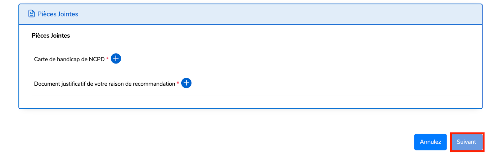 Joignez les pièces jointes requises dans le format approprié, puis cliquez sur Suivant.