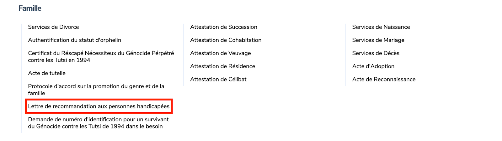 Rendez-vous sur la plateforme IremboGov à l’adresse www.irembo.gov.rw, sous Famille, sélectionnez le service “ Lettre de recommandation aux personnes handicapées ”.