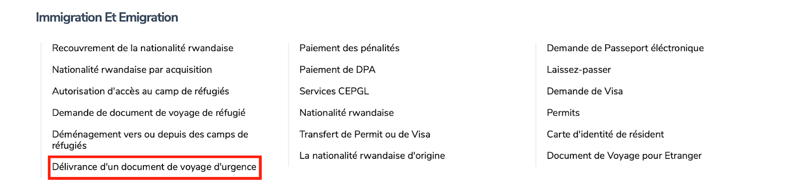 Ce service facilite la délivrance d'un document de voyage d'urgence aux Rwandais ou aux résidents rwandais vivant à l'étranger, aux étrangers au Rwanda ou à leurs enfants nés au Rwanda, qui ont perdu leurs documents de voyage et doivent rentrer chez eux.Le service est fourni La Direction générale de l’Immigration et de l’Émigration (DGIE)