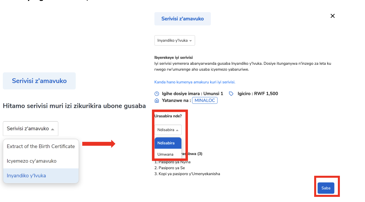 3. Hitamo serivisi y’amavuko wifuza ari yo “Inyandiko y’Ivuka,” uwo usabira niba ari “Ndisabira cyangwa Umwana,” ukande kuri Saba.