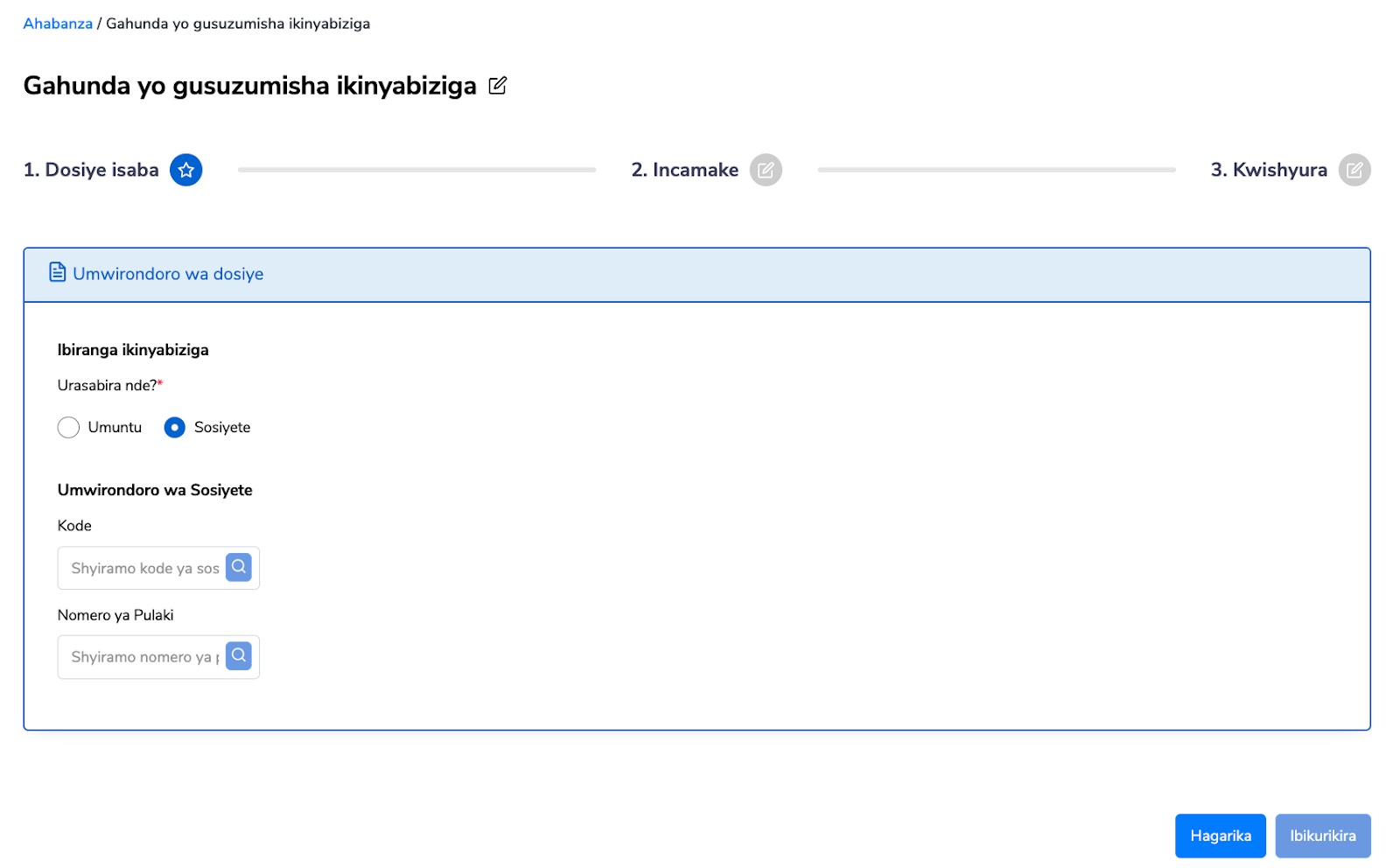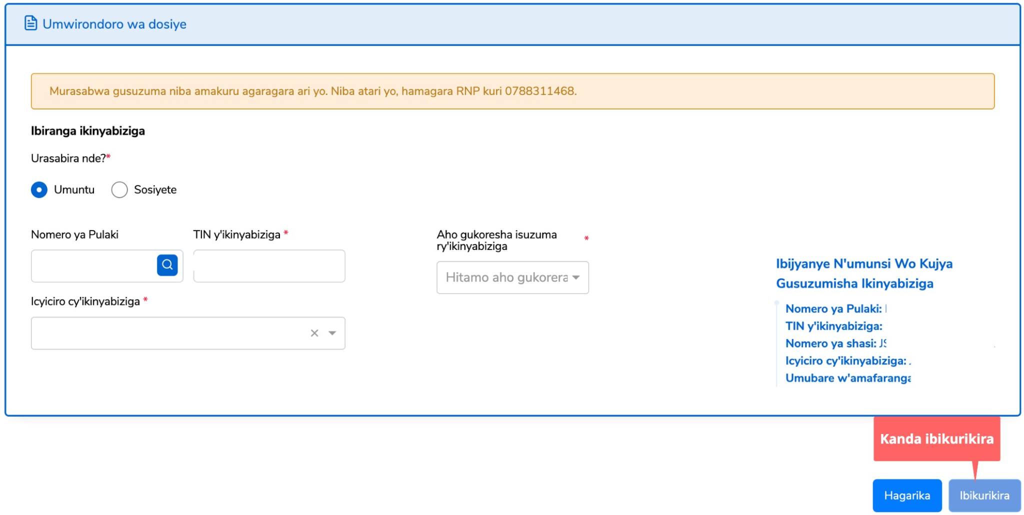 Hitamo uwo usabira “Ndisabira” cyangwa “Sosiyete,”. Uzuza Umwirondoro wa dosiye. imyirondoro y’ikinyabiziga ihita igaragara hejuru kuri paji. Kanda kuri Ibikurikira maze ukomeze.