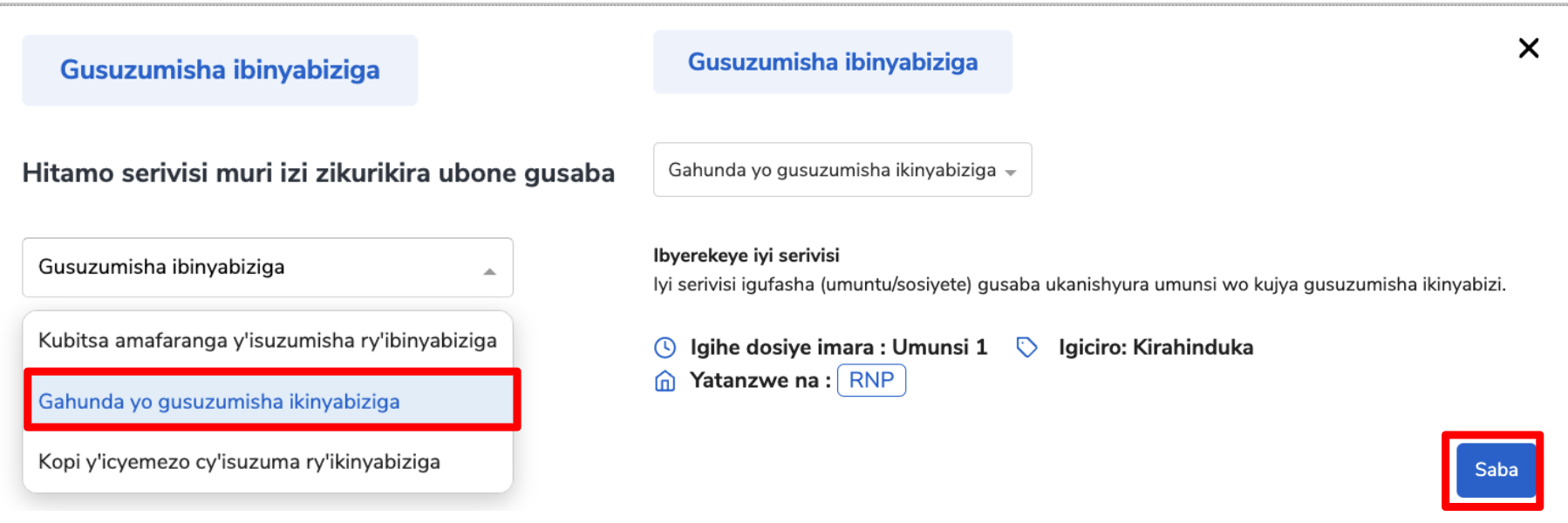 Iyi serivisi yemerera abantu cyangwa sosiyete gusaba gahunda yo gusuzumisha ibinyabiziga no kwishyurira iyo serivisi. Serivisi itangwa na Polisi y’Igihugu (RNP).