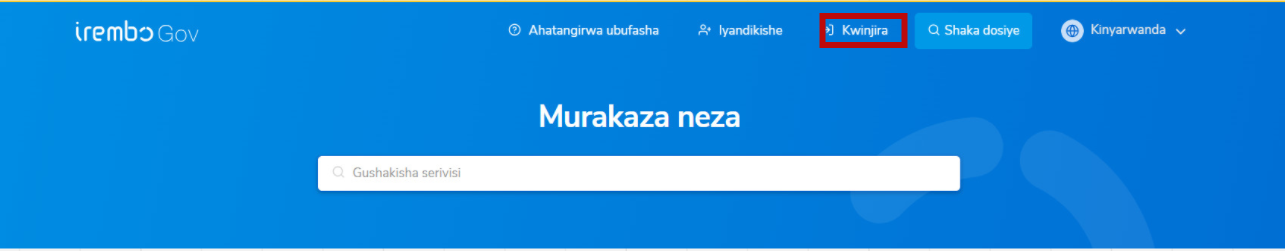 Sura www.irembo.gov.rw hanyuma ukande kuri Injira utangire gusaba iyi serivisi.