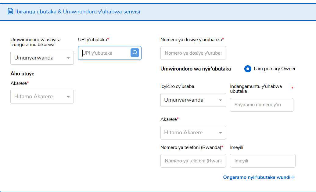 Injiza amakuru y’ubutaka n’amakuru y’uwungukira ku butaka (Beneficiary Details). Aya makuru agaragara ku ruhande rw’iburyo rw’urupapuro. Itorero/Umuryango udaharanira inyungu (NGO)/Koperative/Ihuriro ry’umwuga bigomba kugira izina, nimero ya gazeti (gazette number), aderesi, na UPI, naho ikigo (company) kigomba kugira izina, TIN, aderesi, na UPI.