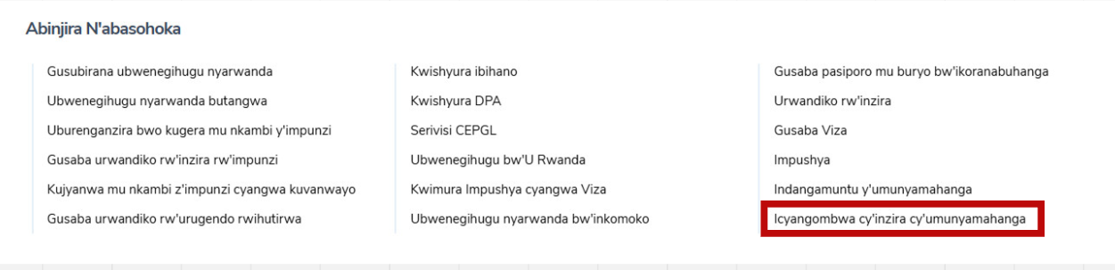 Sura www.irembo.gov.rw hanyuma munsi ya “Abinjira N’abasohoka,” ukande kuri Icyangombwa cy’inzira cy’umunyamahanga.