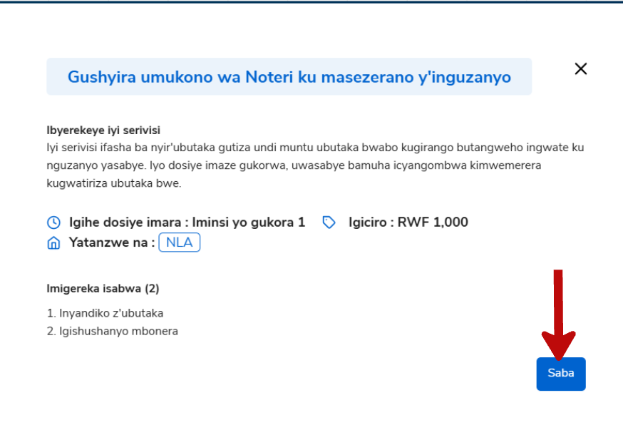 ICYITONDERWA: Nyuma yo gusaba no kwishyura neza binyuze kuri IremboGov, usaba ahabwa ubutumwa bumenyesha binyuze kuri SMS cyangwa imeyili bwemeza ko ubwishyu bwakiriwe. Nyuma y’iminsi 7, usaba arasabwa kujya ku Murenge ajyanye inyandiko zisabwa kugira ngo akomeze gutunganyirizwa dosiye ye.