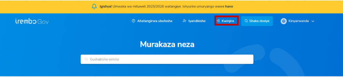 1. Sura www.irembo.gov.rw maze ukande kuri Injira kugira ngo utangire gusaba.