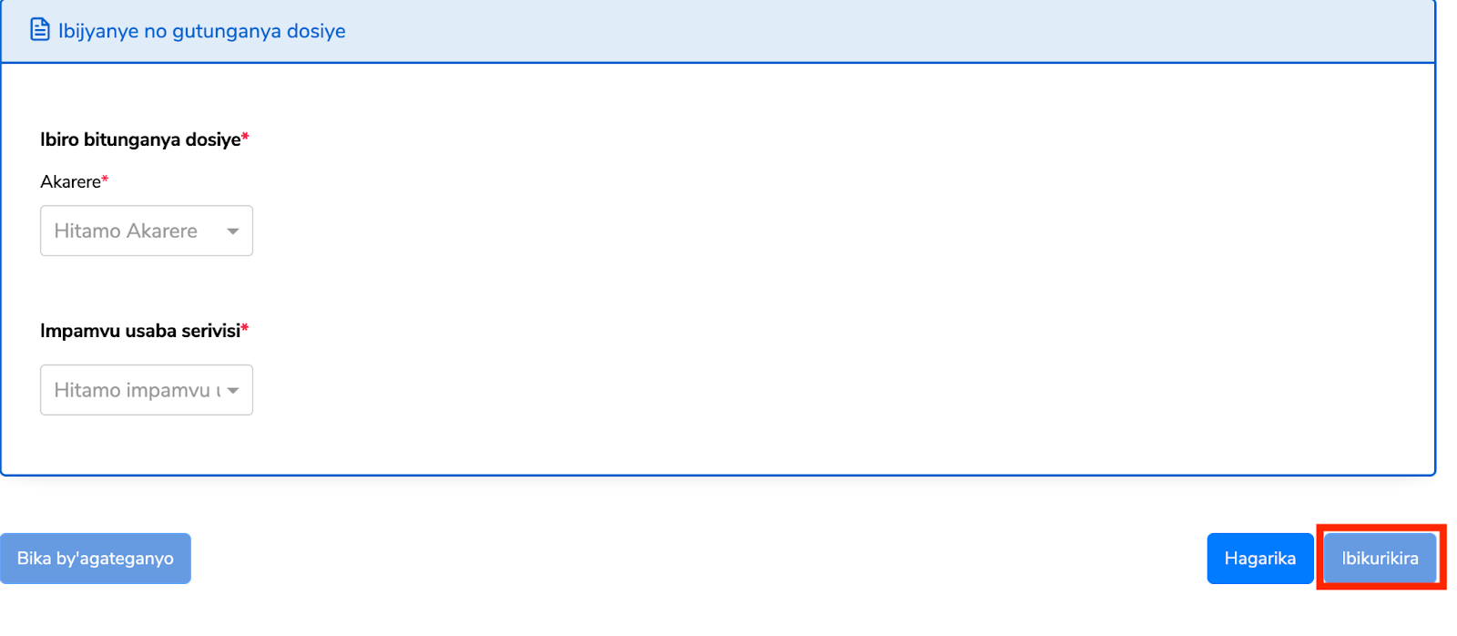 Uzuza Ibijyanye no gutunganya dosiye (Ibiro bitunganya dosiye n’impamvu usaba serivisi), niba wahisemo umwana uraza kongeraho nomero y’ifishi y’umwenegihugu hanyuma ukande “Ibikurikira”.