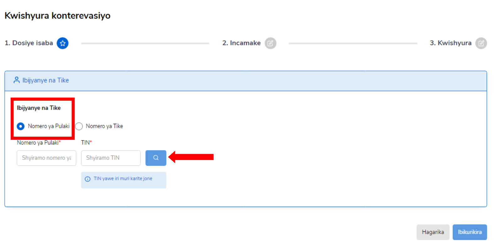 Kwishyura, usaba ashobora gushyiramo Nomero ya purake na TIN (TIN iboneka kuri karate jone) cyangwa Nomero ya tike maze agahitamo konterevasiyo yifuza kwishyura (zose cyangwa zimwe).