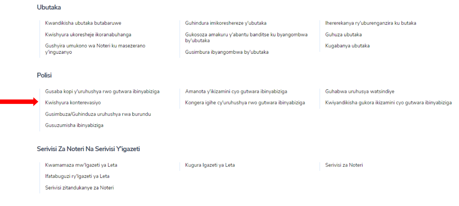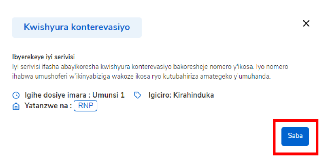 Iyi nyandiko ikwereka uburyo wagenzura ukanishyura konterevasiyo ukoresheje nomero ya purake hamwe na nomero ya TIN cyangwa itike. Nomero ya tike ihabwa umushoferi w’ikinyabiziga wakoze ikosa ryo kutubahiriza amategeko y’umuhanda. Usaba ashobora kwishyurira itike imwe cyangwa nyinshi, biterwa n’amafaranga afite. Iyi serivisi itangwa na Polisi y’Igihugu (RNP).