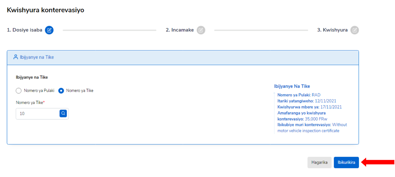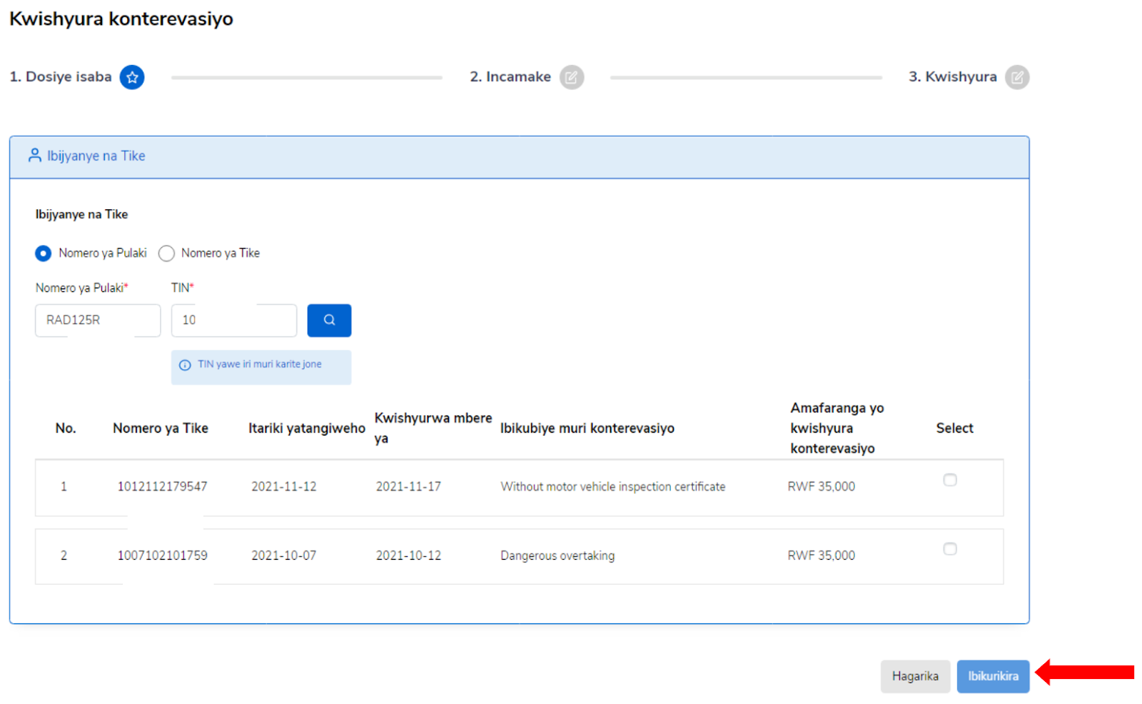 Iki gice kikwereka uburyo wakwishyurira konterevasiyo ukoresheje nomero ya purake hamwe na nomero ya TIN cyangwa itike. Nomero ya tike ihabwa umushoferi w’ikinyabiziga wakoze ikosa ryo kutubahiriza amategeko y’umuhanda. Usaba ashobora kwishyurira itike imwe cyangwa nyinshi, biterwa n’amafaranga afite.