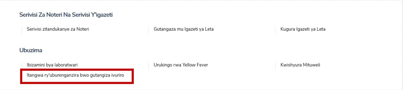 Intambwe ya 1: Sura urubuga rwa IremboGov kuri www.irembo.gov.rw, maze munsi y’icyiciro cya “Ubuzima”, hitamo itangwa ry’uburenganzira bwo gutangiza ivuriro.