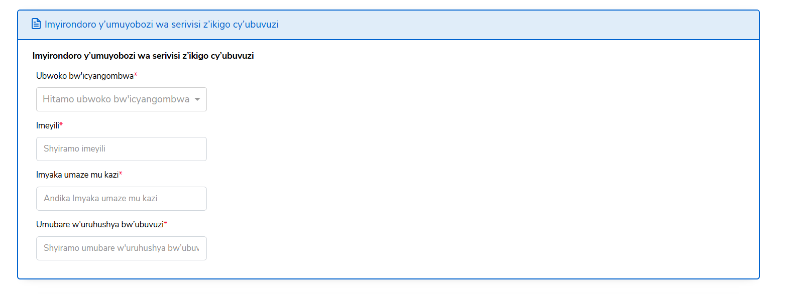 Intambwe ya 4: Uzuza amakuru y’Umuyobozi wa serivisi z’ubuvuzi (Clinical Service Director), arimo ubwoko bw’inyandiko y’indangamuntu, imyaka y’uburambe, nomero y’uruhushya rwo kuvura, na nomero y’uruhushya rwo gukora umwuga (practicing license number).