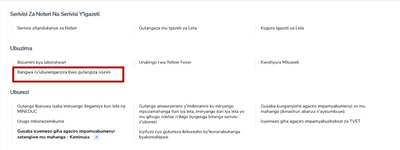 Intambwe ya 1:Sura urubuga rwa IremboGov kuri www.irembo.gov.rw, maze munsi y’icyiciro cy “Ubuzima”, hitamo "Itangwa ry'uburenganzira bwo gutangiza ivuriro."