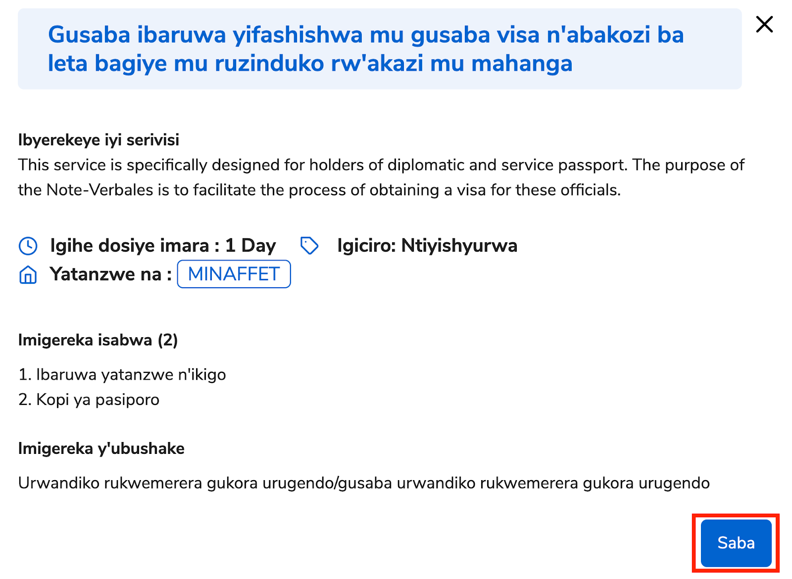 Iyi serivisi yagenewe by'umwihariko abafite pasiporo z'abadipolomate na serivisi. Iki cyemezo cyorohereza inzira yo kubona viza kubayobozi. Iyi serivisi itangwa na minisiteri y'ububanyi n'amahanga n'ubutwererane (MINAFFET)