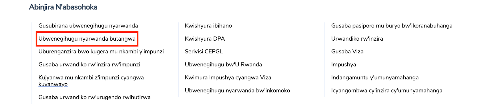 Sura www.irembo.gov.rw hanyuma mu gice cya “Abinjira N'abasohoka”, kanda kuri “Ubwenegihugu nyarwanda butangwa”.