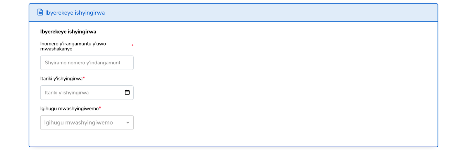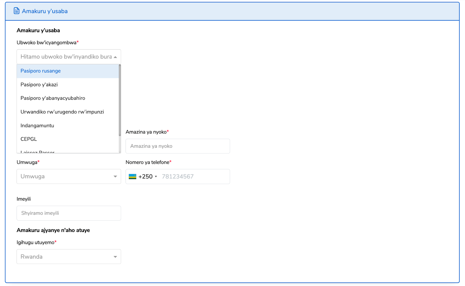 Uzuza amakuru y’usaba n’ubwoko bw’icyangombwa kimuranga, aho atuye, nomero ya telefone, na imeyili.