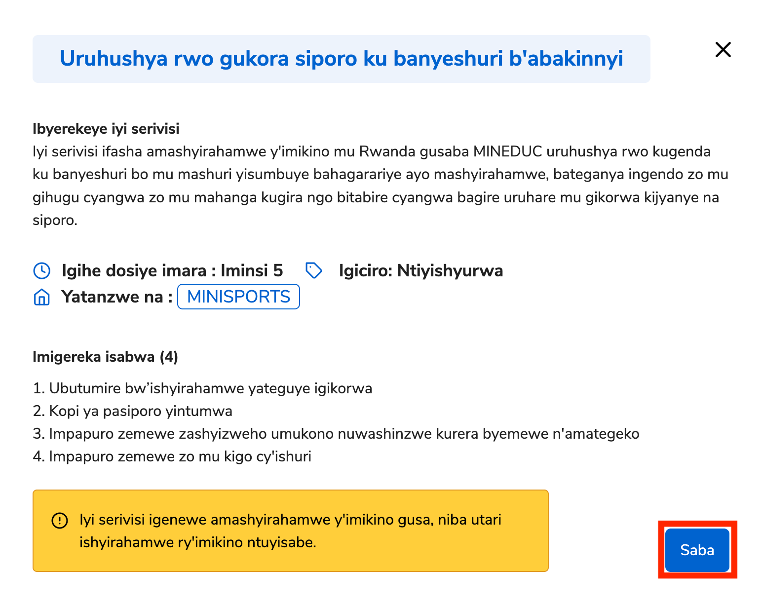 Iyo MINISPORT imaze kwakira no kwemerera ubusabe bwawe, buhita bwoherezwa MINEDUC kugira ngo burangize gutunganywa. Usaba ahita ahabwa icyangombwa cy’ikoranabuhanga kuri imeyili.