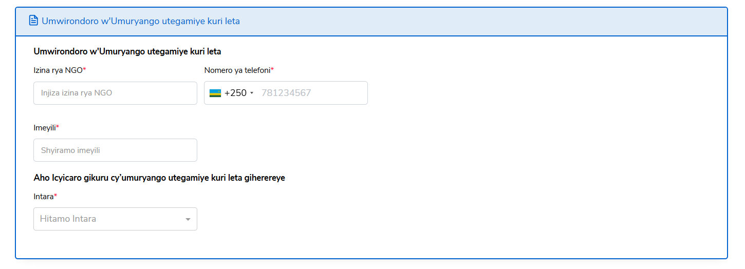 Intambwe ya 4: Uzuza amakuru y’umuryango utegamiye kuri Leta (NGO), harimo amazina yawo, amakuru y’itumanaho yuko wavugishwa (telefoni/imeyili), n’aho uherereye.