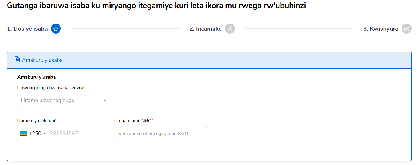 Intambwe ya 3. Uzuza “Amakuru y’usaba”: hitamo ubwenegihugu bw’usaba, amakuru ye yuko yavugishwa (telefoni/imeyili), n’uruhare afite.