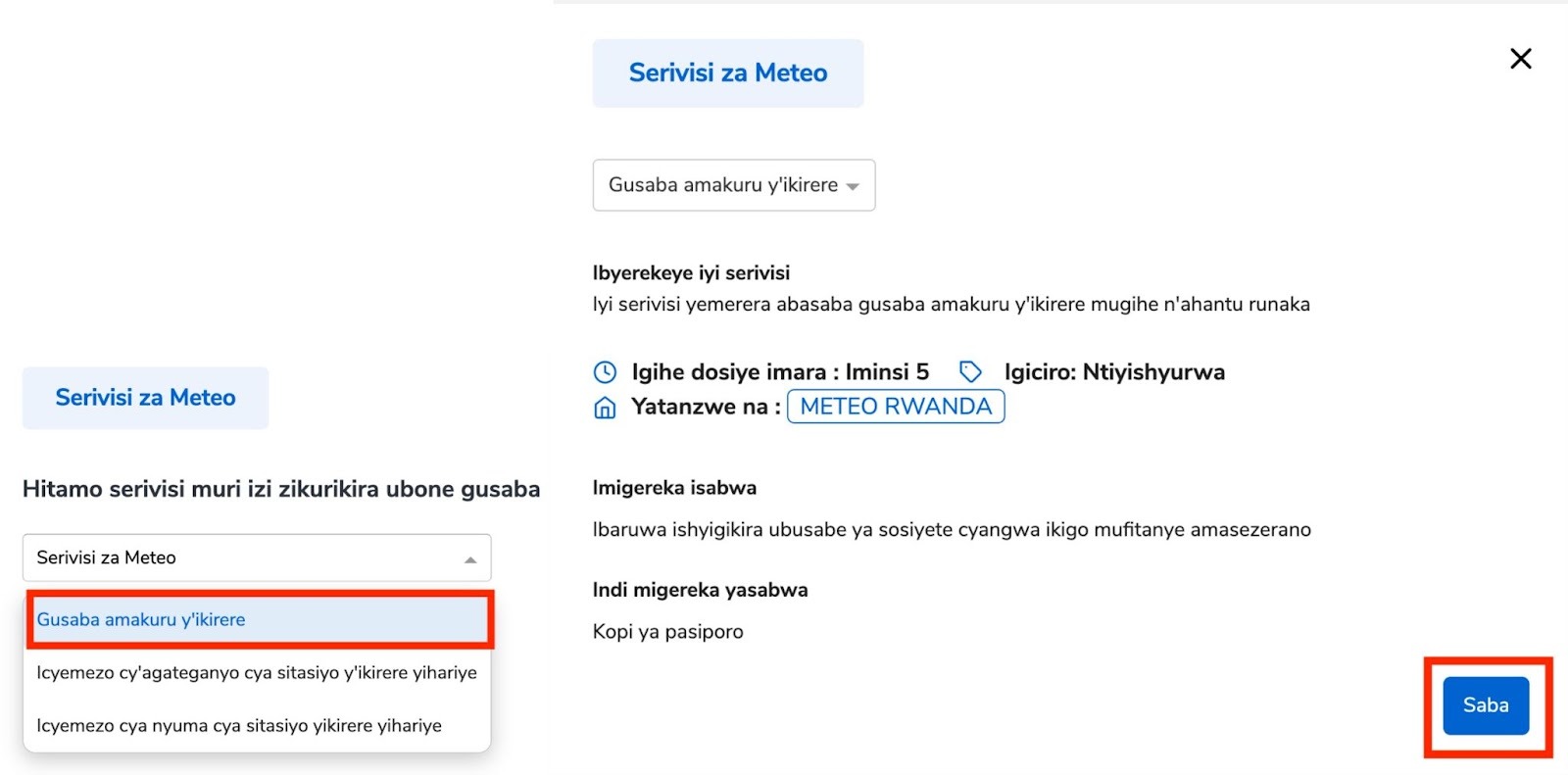 Hitamo “Gusaba amakuru y’ikirere”,hanyuma ukande “Saba”.
