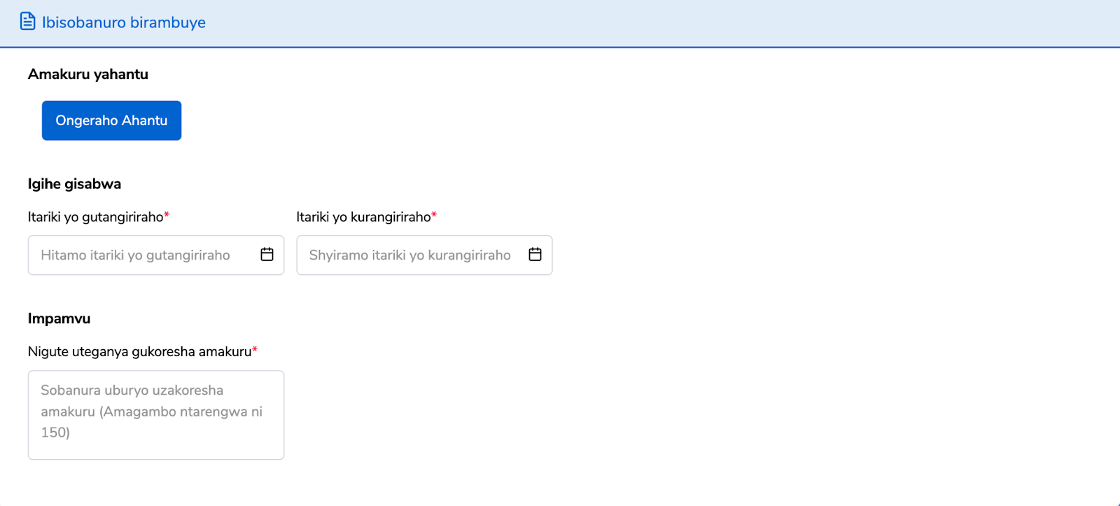 Uzuza Ibisobanuro birambuye ku gihe gisabwa n’impamvu y’ubusabe.