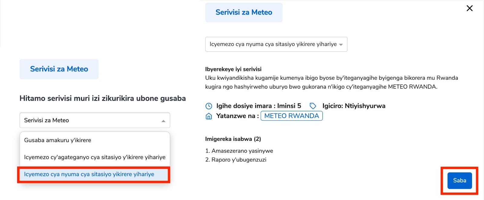 Hitamo “Icyemezo cya nyuma cya sitasiyo y’ikirere yihariye”,hanyuma ukande “Saba”.