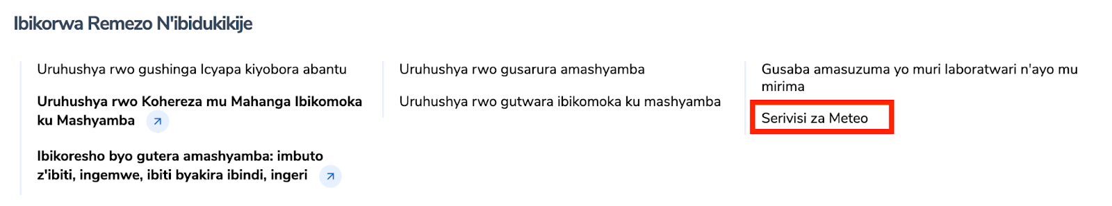 Sura www.irembo.gov.rw ,hanyuma mu gice cy’“Ibikorwa Remezo n’ibidukikije”,Hitamo “Serivisi za Meteo”.