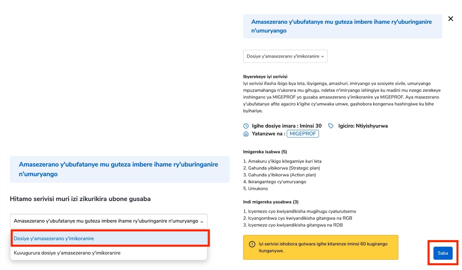 Hitamo “ Dosiye y’amasezerano y’imikoranire”,hanyuma ukande “Saba”.
