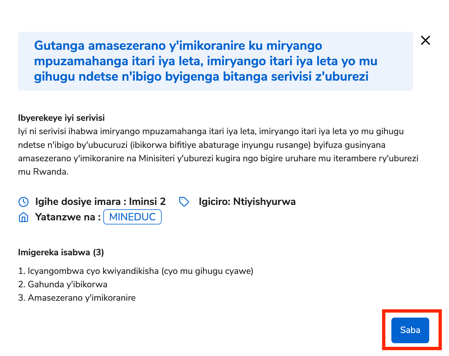 Iyi ni serivisi ihabwa imiryango mpuzamahanga itari iya leta, imiryango itari iya leta yo mu gihugu ndetse n'ibigo by'ubucuruzi (ibikorwa bifitiye abaturage inyungu rusange) byifuza gusinyana amasezerano y'imikoranire na Ministeri y'uburezi (MINEDUC) kugira ngo bigire uruhare mu iterambere ry'uburezi mu Rwanda.Iyi serivisi itangwa na Ministeri y’uburezi.