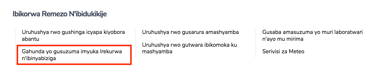 Shakisha serivisi yo “Gusaba Isuzuma ry’imyuka y’ibinyabiziga ” iri mu cyiciro cya “Ibikorwa Remezo n’Ibidukikije”, hanyuma uyikandeho.