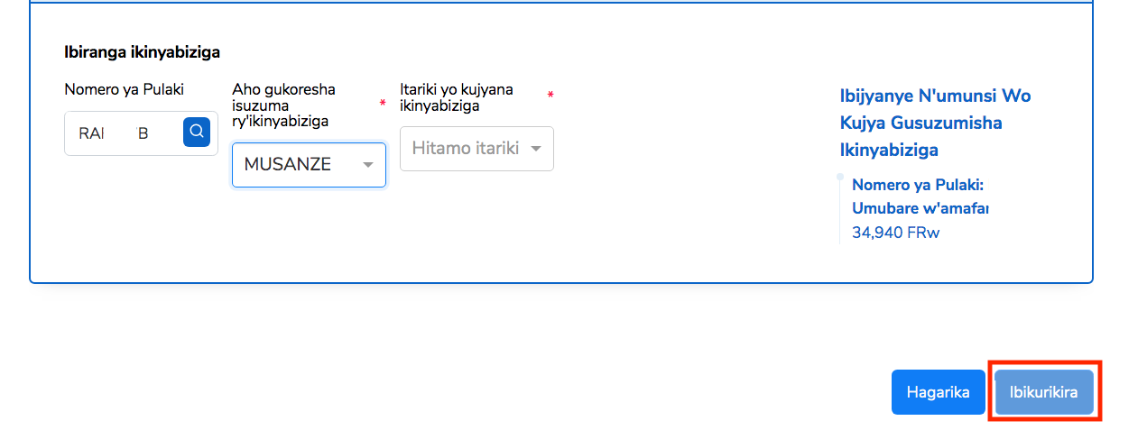 Injiza amakuru y’ikinyabiziga (nomero ya pulaki), hanyuma wemeze ubuziranenge bwo gusaba; nomero ya pulaki n’amafaranga uzishyura bizahita bigaragara.