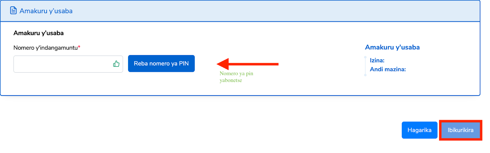 Uzuza nomero y’indangamuntu y’usaba,nyuma ukande kuri Reba nomero ya PIN.Ukirangiza kubona nomero ya PIN,kanda “Ibikurikira”.