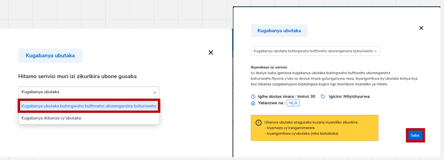 Hitamo “ubutaka buhingwaho bufitweho uburenganzira buhiriweho” maze ukande kuri Saba.