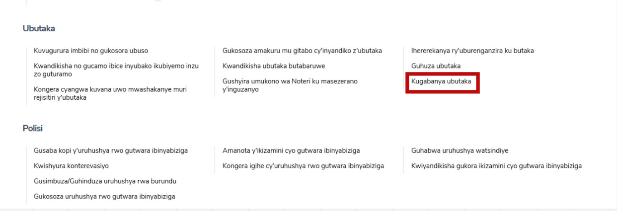 Iyi serivisi ifasha ba nyiri ubutaka gusaba kugabanya igice kimwe cy’ubutaka kikavamo ibice bito. Ubu busabe bureba igabanywa ry’ubutaka bw’ubuhinzi bufitwe n’abantu barenze umwe. Iyo ubusabe bumaze gutunganywa neza, hatangwa ibyemezo bishya by’ubutaka kuri buri gice cyagabanyijwe, bigasimbura ibyari bisanzwe.