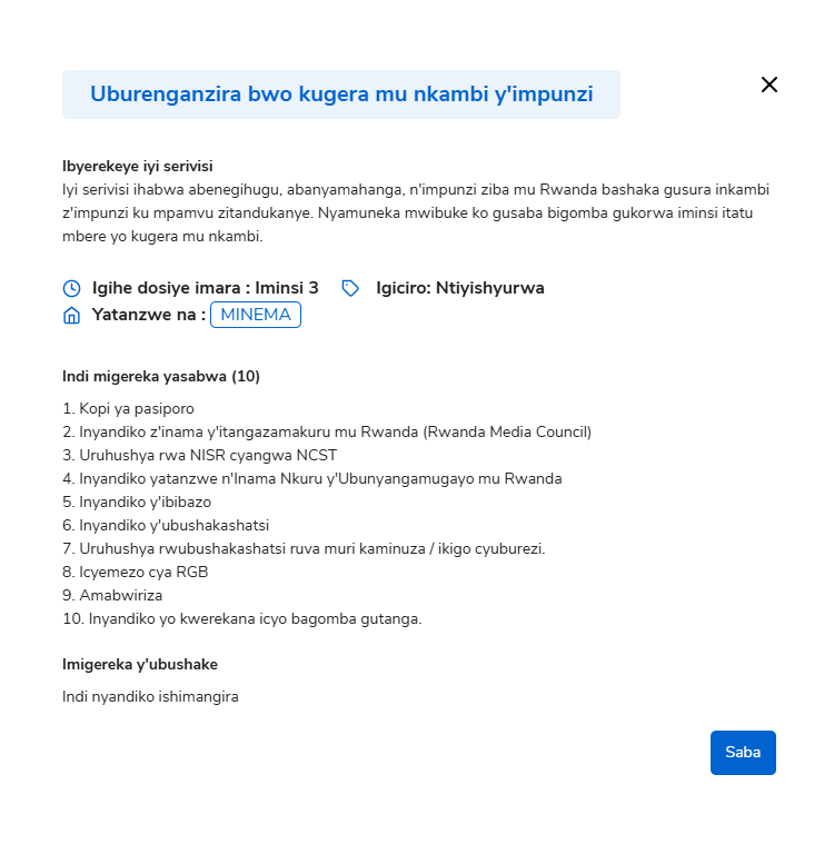 Nyuma yo kohereza ubusabe bwawe, buzatunganywa n’ibiro bya PS na MINEMA mu Rwanda. Uzahabwa ubutumwa bwa email cyangwa SMS bukumenyesha impinduka zose zijyanye n’ubusabe bwawe.