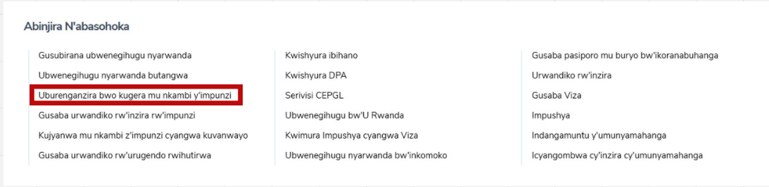 Sura urubuga rwa Irembo kuri www.irembo.gov.rw, ujye mu cyiciro cya “Abinjira N’abasohoka”, hanyuma ukande kuri “Uburenganzira bwo kugera mu nkambi z’impunzi”.