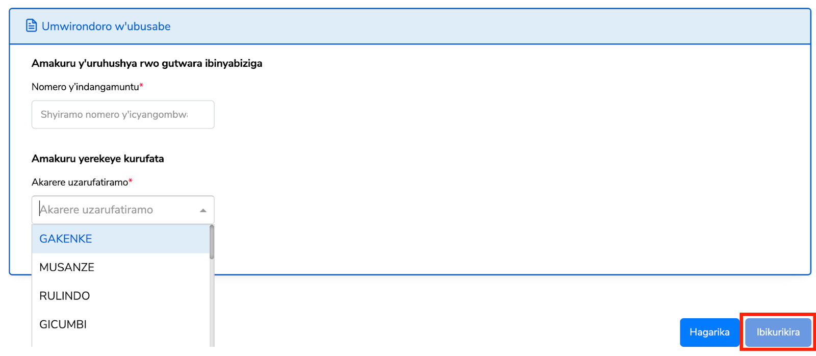 Intambwe ya 3: Uzuza amakuri y’usaba (nomero y'indangamuntu n'akarere uzayifatiramo).
