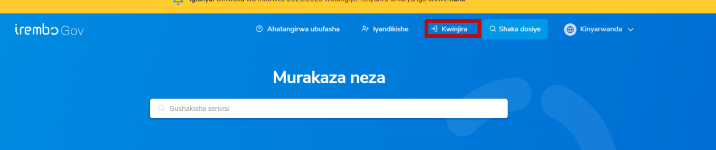 Sura www.irembo.gov.rw hanyuma ukande kuri Kwinjira kugira ngo utangire gusaba iyi serivisi.