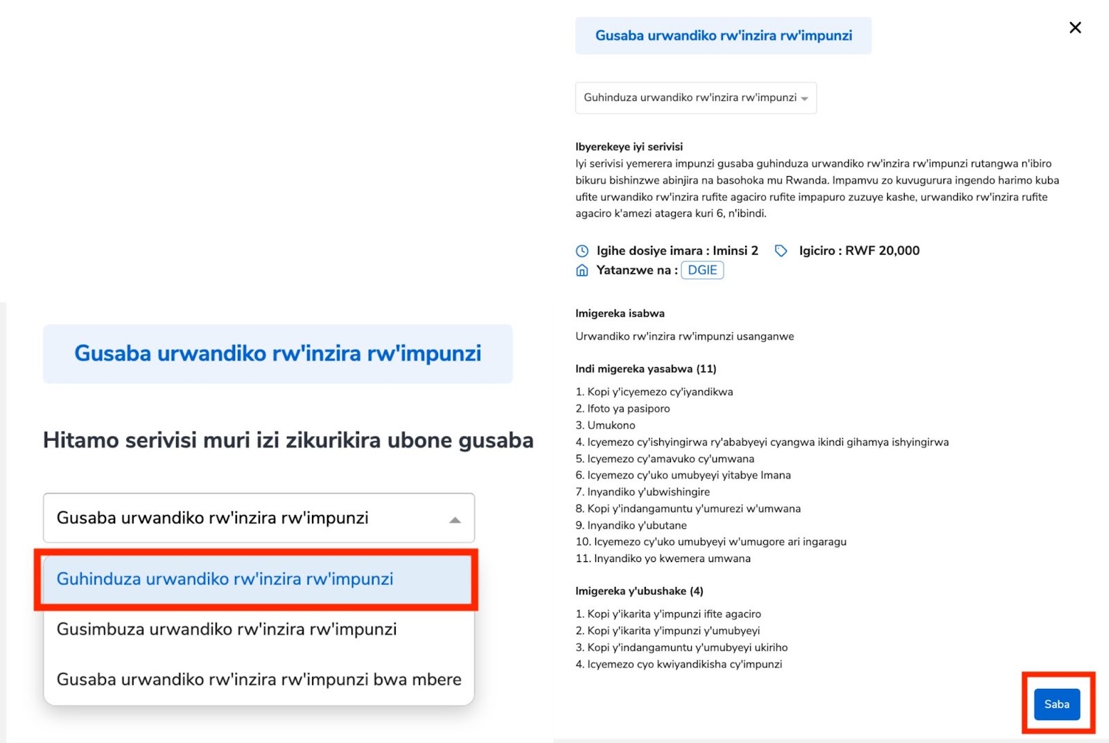 Hitamo “Guhinduza urwandiko rw’inzira rw’impunzi”,hanyuma ukande “Saba”.