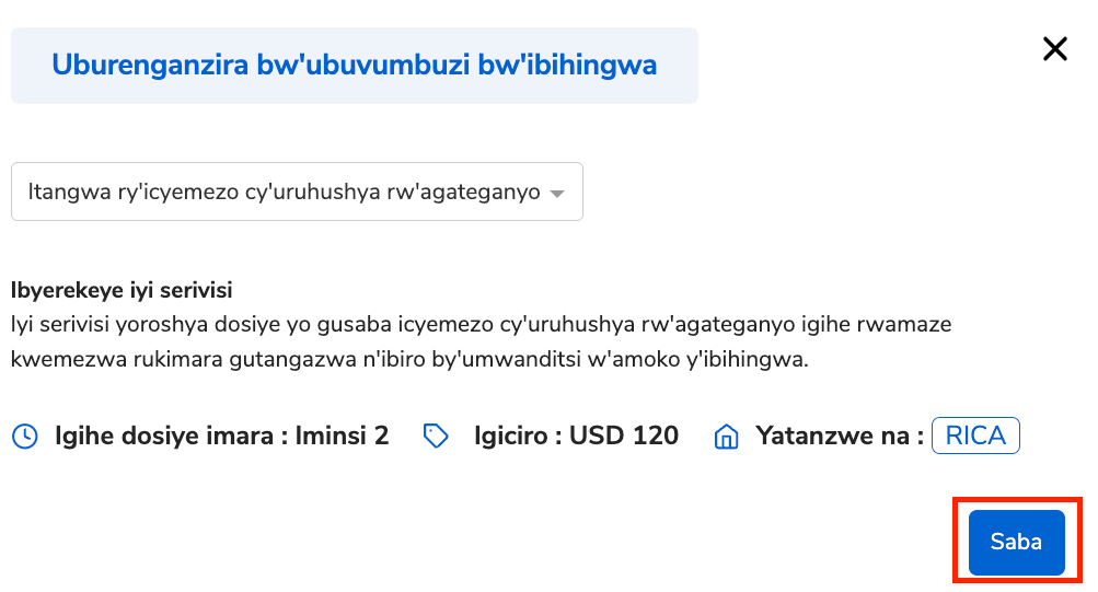 Injiza nimero ya dosiye baguha iva mu “Gusaba uburinzi bw’agateganyo” hanyuma uhitemo niba iyo dosiye yararangije igihe cy’imenyekanisha cy’iminsi 60, hanyuma ukande “Komeza”.